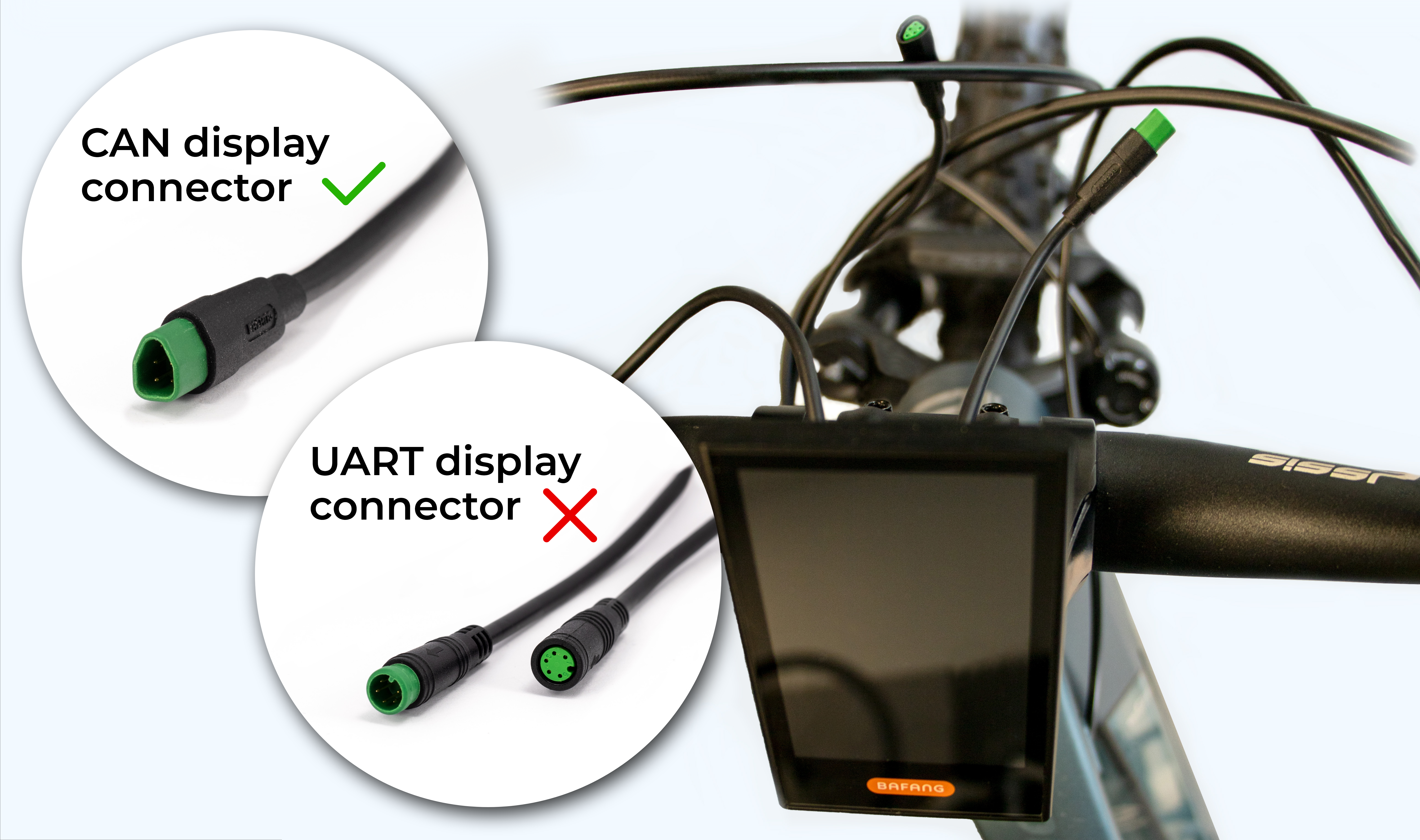 Odpoj konektor displeje a podle tvaru konektoru ověř, jestli tvé elektrokolo používá komunikaci UART nebo CAN .
