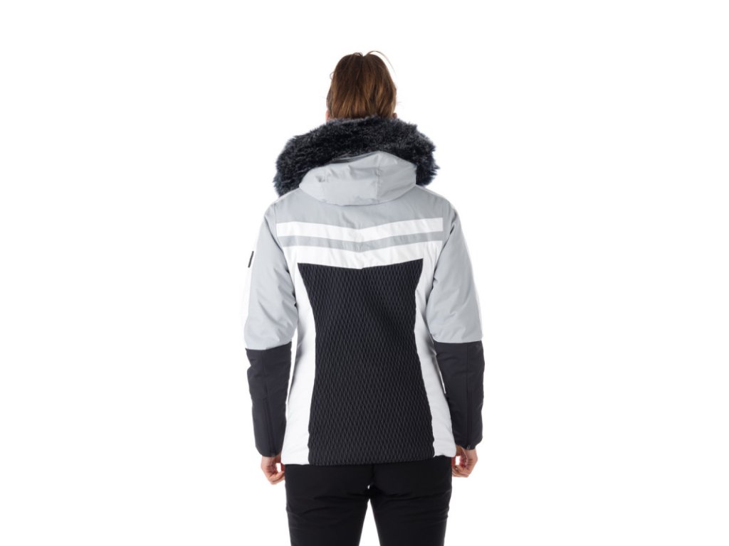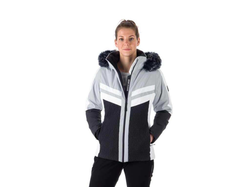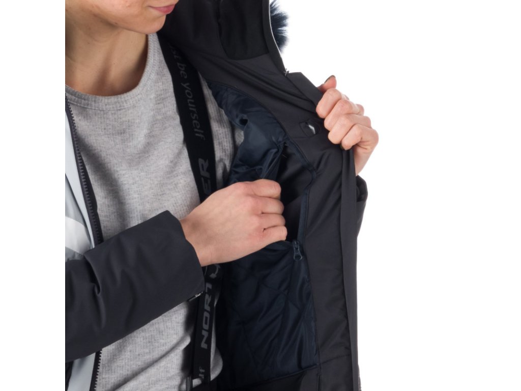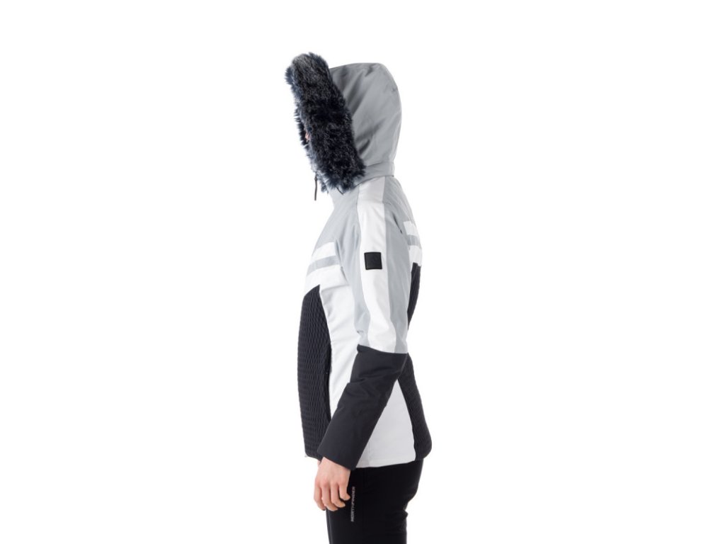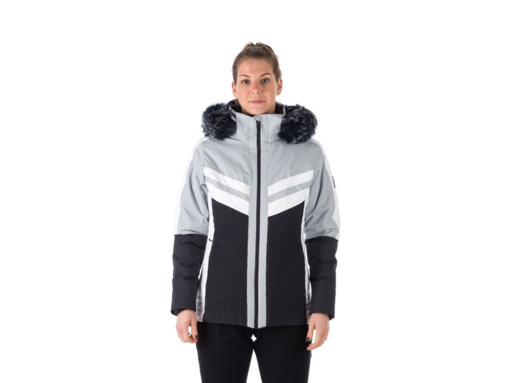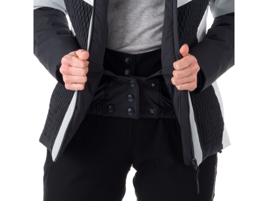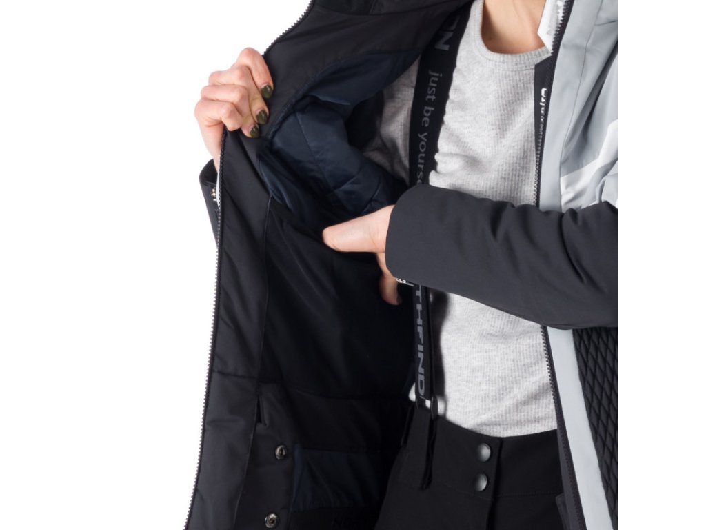 Trendy lyžařská bunda polopřiléhavého střihu je určena pro sjezdové lyžování. Díky atraktivnímu designu prošívání a výrazným barevným kombinacím budeš na svahu nepřehlédnutelná. Bunda je vyrobena z membránového materiálu, který spolehlivě ochrání před vlhkostí a promočením, přičemž je zároveň prodyšný, takže umožní aktivní pohyb bez zbytečného zpocení. Ochranu před vniknutím vlhkosti také poskytují podlepené kritické švy. Bunda je zateplena jemným syntetickým rounem, které je poddajné a elastické a dobře se přizpůsobí pohybu. Vodoodpudivá úprava materiálu bez použití PFC sloučenin zajistí, že dešťové kapky nebo tekuté nečistoty nevsáknou do povrchu materiálu, ale po něm stečou. Úprava je odolná vůči praní, takže můžete výrobek prát tak často, jak budete potřebovat.