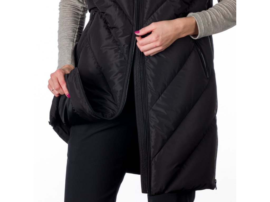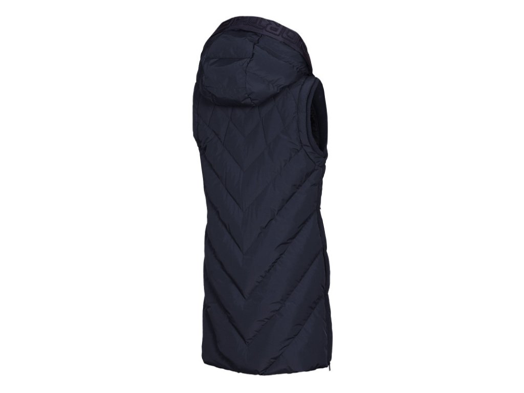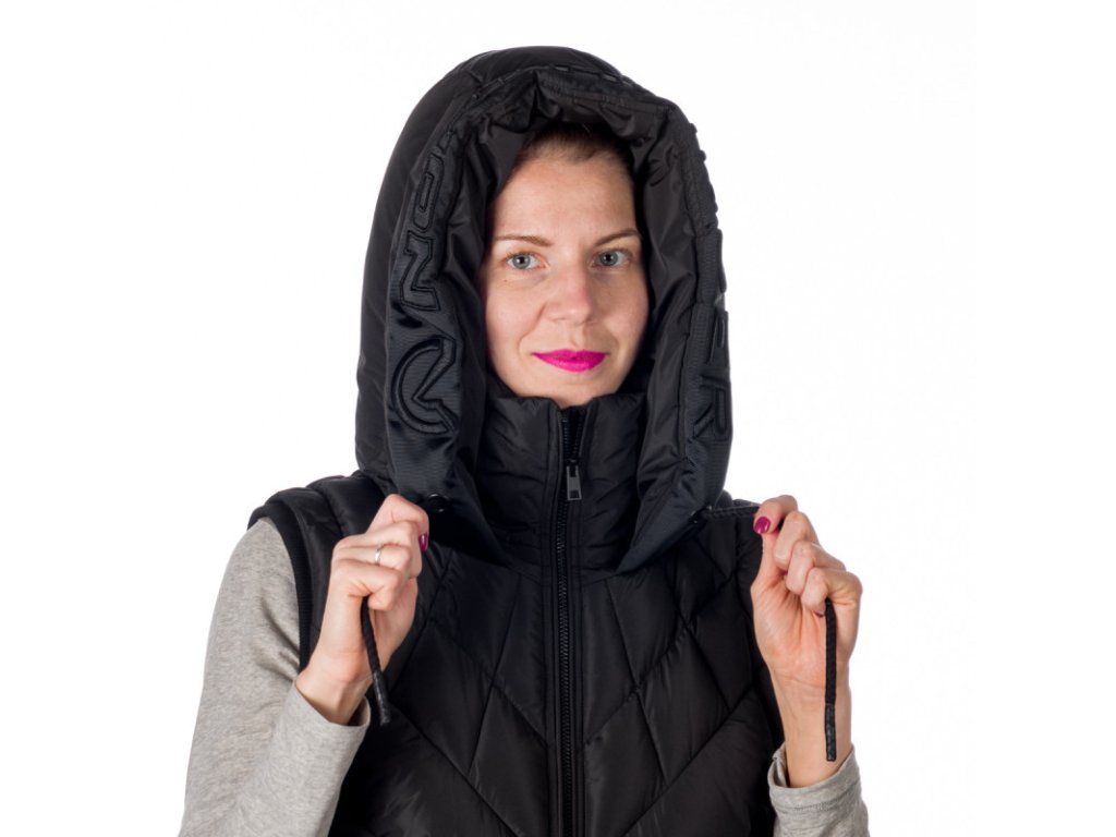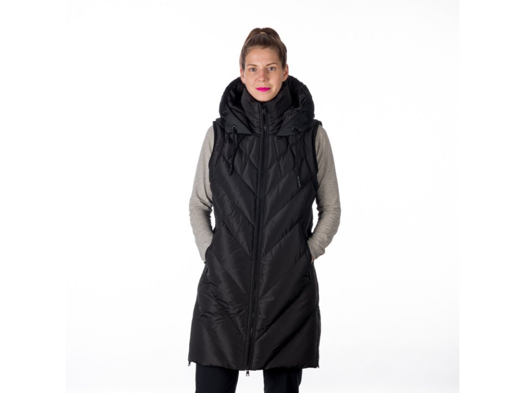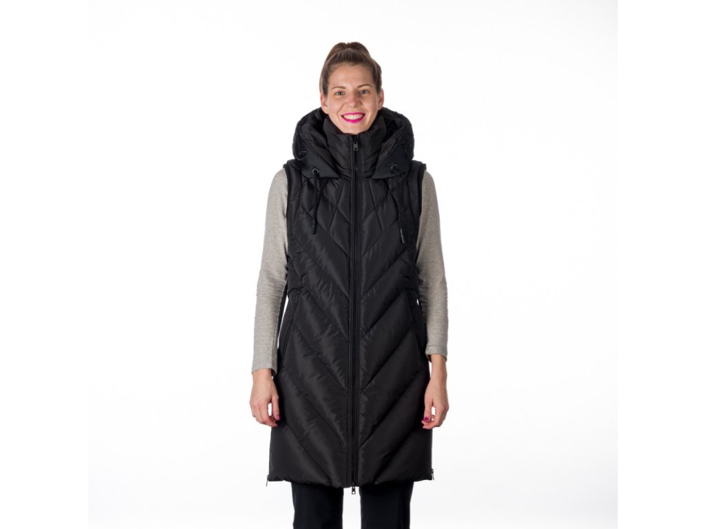 Městská vesta v trendovém prošívaném designu. Bunda je zateplena syntetickou izolací připomínající prachové peří, disponuje fixní 2D kapucí, dvěma bočními kapsami a elastickým lemem kolem průramků. Materiál je opatřen ekologickou voděodolnou úpravou bez PFC látek.