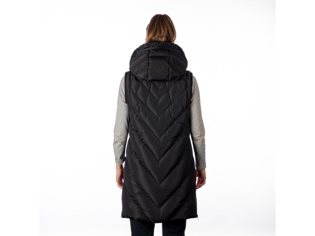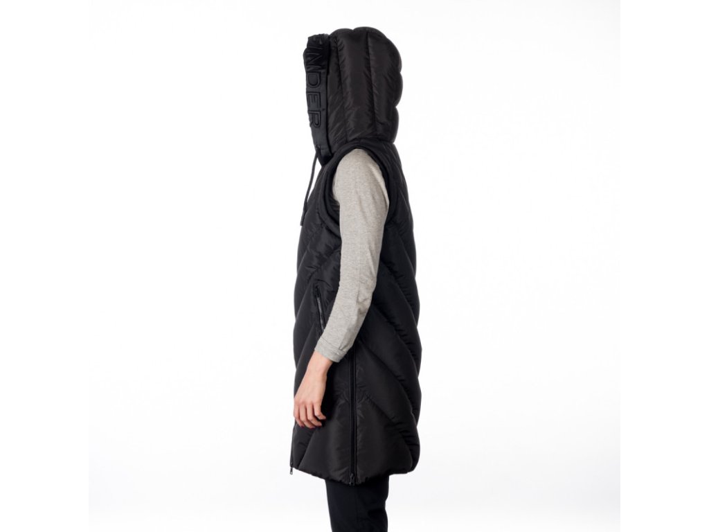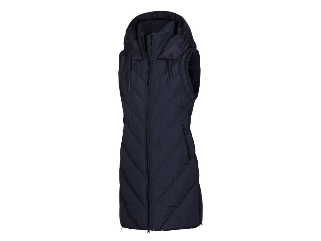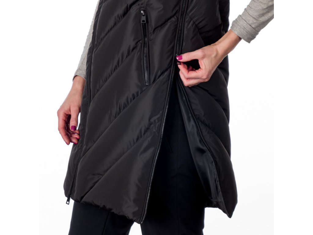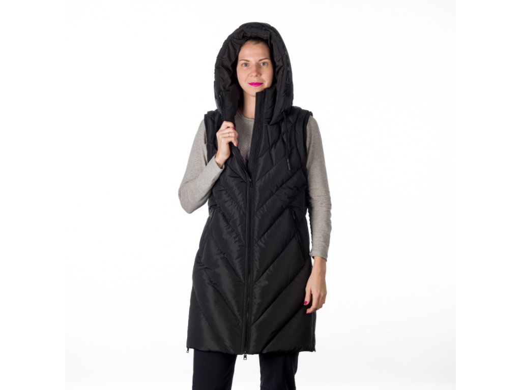 Městská vesta v trendovém prošívaném designu. Bunda je zateplena syntetickou izolací připomínající prachové peří, disponuje fixní 2D kapucí, dvěma bočními kapsami a elastickým lemem kolem průramků. Materiál je opatřen ekologickou voděodolnou úpravou bez PFC látek.