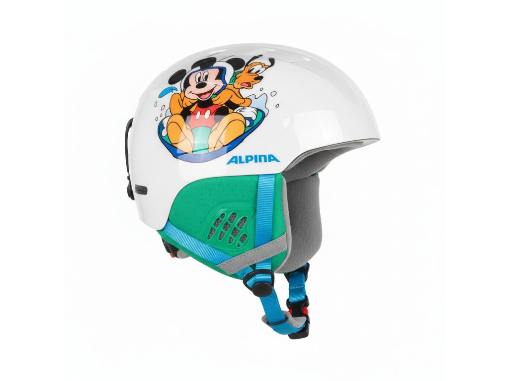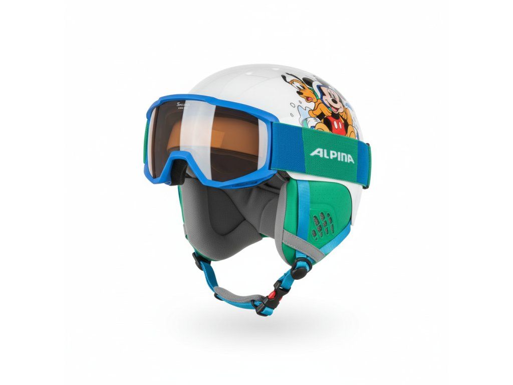 Dětský lyžařský set Alpina Sport CARAT DISNEY SET MICKEY se skládá z lyžařských brýlí Alpina Piney a helmy Alpina Carat, která je potištěná unikátním designem. Alpina Piney jsou výborné lyžařské brýle se systémem Singleflex a HICON. Systémem Singleflex zaručuje 100 % UV-A, UV-B a UV-C ochranu do 400nm. Díky technologii Fogstop nedochází k zamlžování tvrzených čoček. Měkké polstrování zajišťuje velmi vysoký stupeň pohodlnosti. Lyžařská helma Alpina Carat je velmi bezpečná a pohodlná dětská helma s pevnými polstrovanými chrániči přes uši. Technologie Inmold zaručuje bytelnost a lehkost helmy. Regulační kolečko (Run system) umožní snadno a rychle uzpůsobit velikost helmy potřebám každého uživatele, čímž helma pevně sedí na hlavě. Vnitřek helmy se dá vyjmout a vyčistit. Vzduchové ventily zajišťují dostatečné odvětrávání. Tuto kombinaci si děti určitě zamilují.