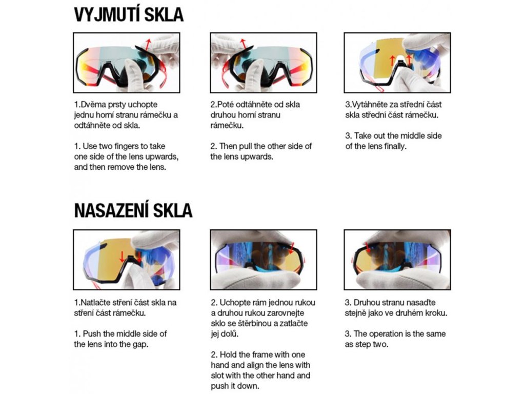 Součástí balení jsou i další dvě náhradní skla, žluté do špatných světelných podmínek a polarizační pro odstranění nepříjemných odlesků.