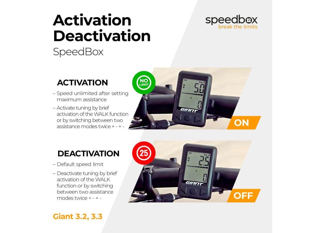 Také tento produkt se vyznačuje snadným ovládáním. Aktivaci čipu SpeedBox provedeš přímo v mobilní aplikaci nebo na displeji elektrokola. Neaktivuj tuning za jízdy! Po krátké aktivaci funkce WALK se na displeji zobrazí hodnota 5.0 km/h (3.1 mph) a od té chvíle můžeš jet rychlostí až 50 km/h. Výchozí rychlostní limit můžeš změnit na libovolný limit (do 50 km/h), avšak pro minimalizaci rizika chybových kódů doporučujeme nepřekračovat 50 km/h.